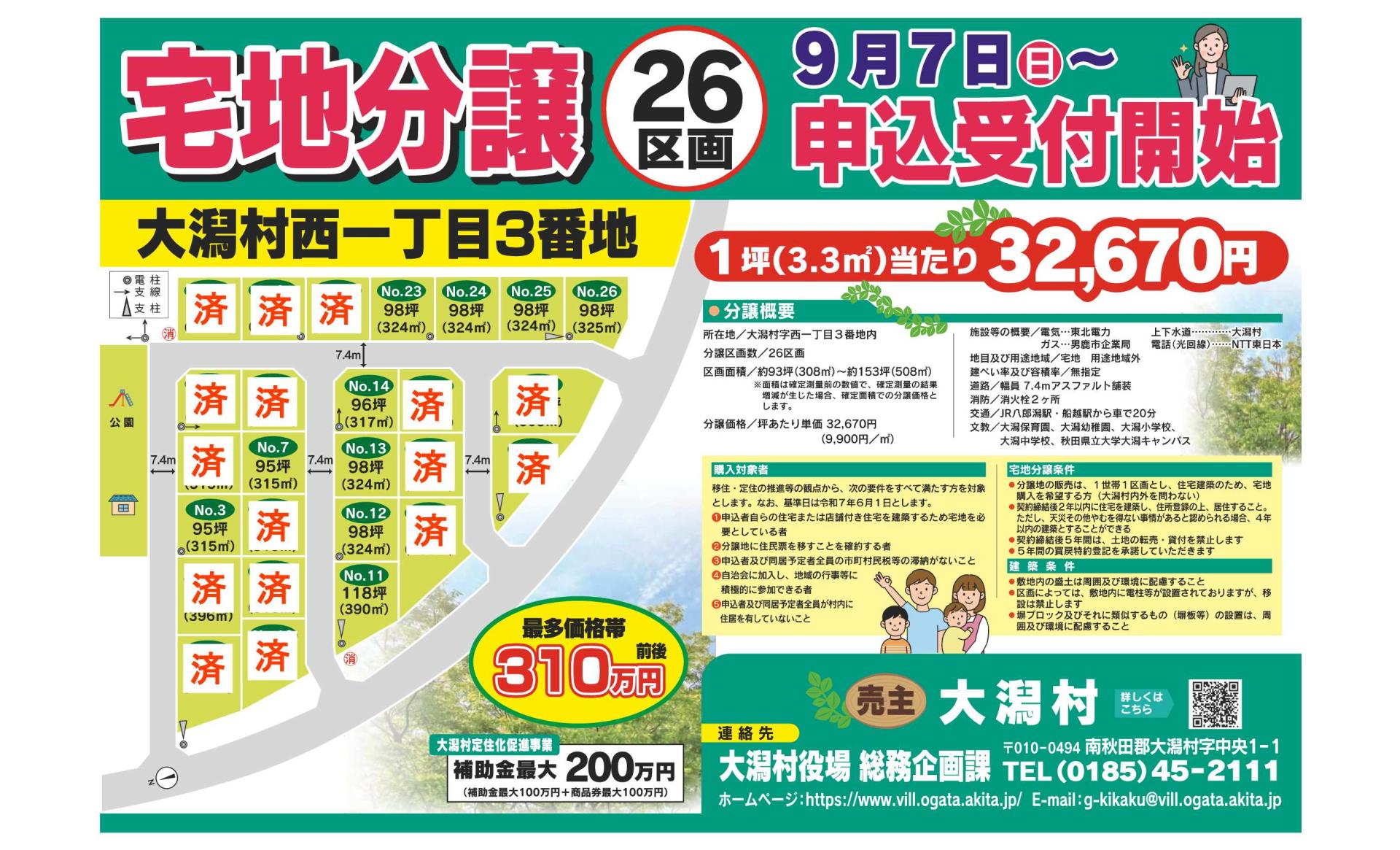 大潟村では、人口減少対策のため、移住定住を促進する観点から、西一丁目3番地に造成した分譲地の販売を次のとおり行います。