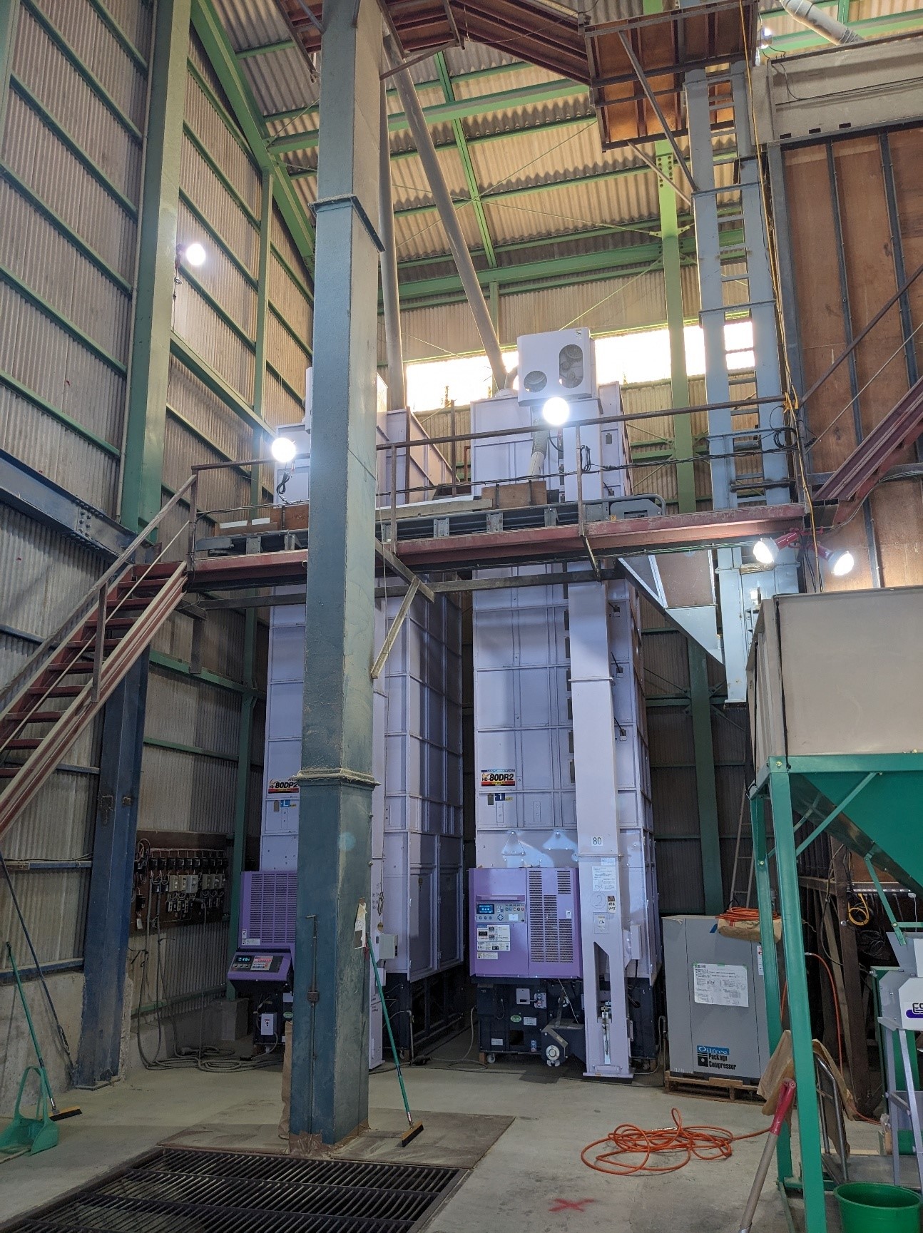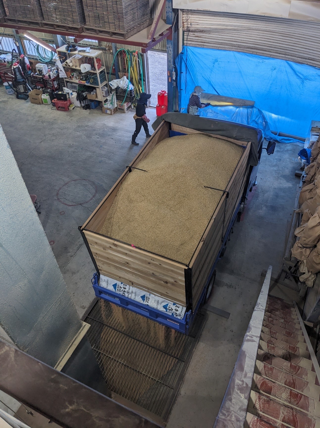 その後、コンバインが戻ってきてダンプを再び満たすのを待ち、大きな倉庫へ向かい、乾燥機に籾を投入しました。籾を機械に入れすぎないよう加減に注意しながらの作業で、これもなかなかの挑戦でした。作業が終わった後は再び田んぼに戻り、同じ工程を繰り返す予定でしたが、私の「シフト」はここで終了となりました。
