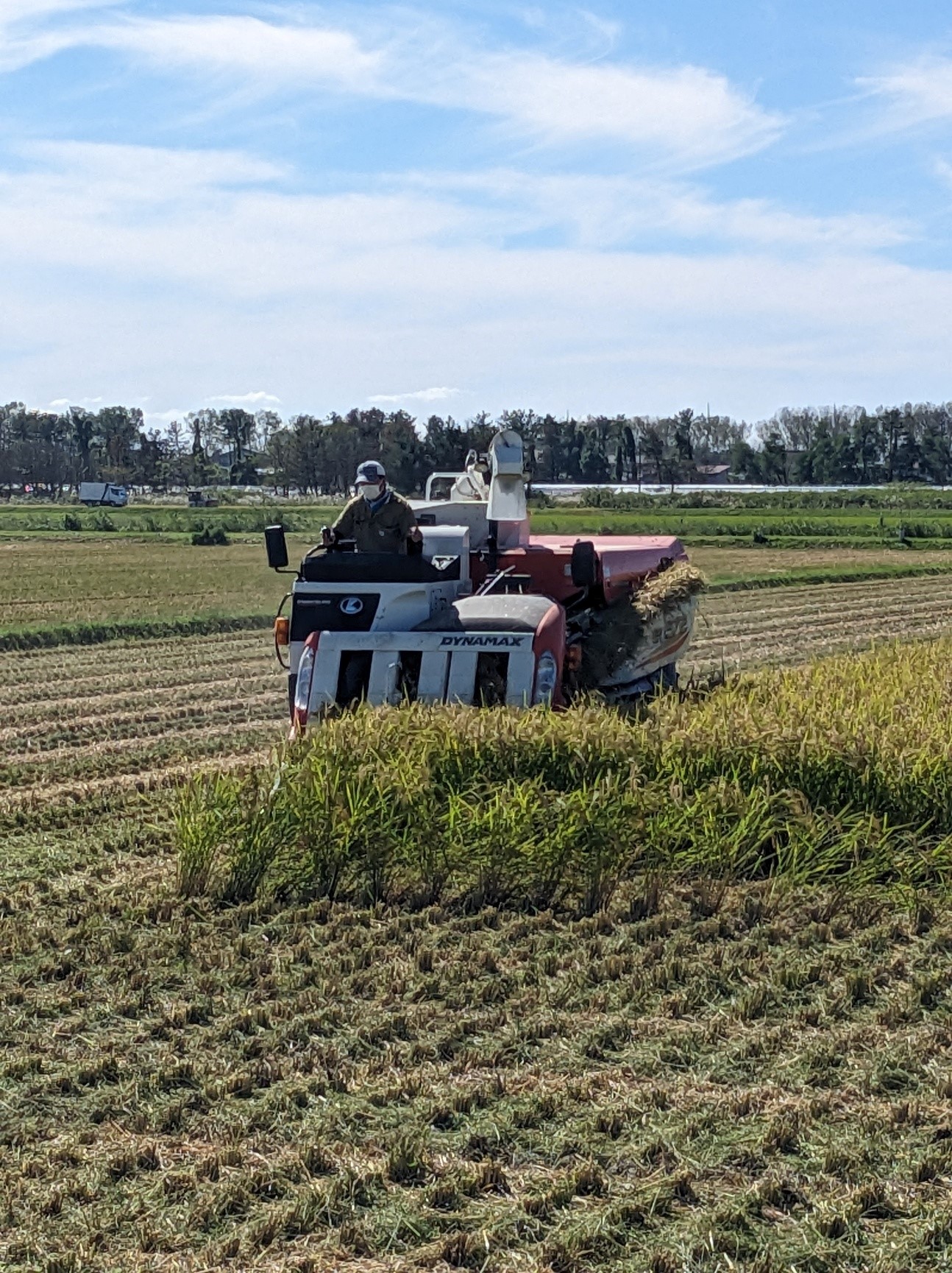 私の一日は13時30分から始まりました。田んぼに到着すると、すでに斉藤さんたちは一枚の田んぼで稲刈りの真っ最中でした。