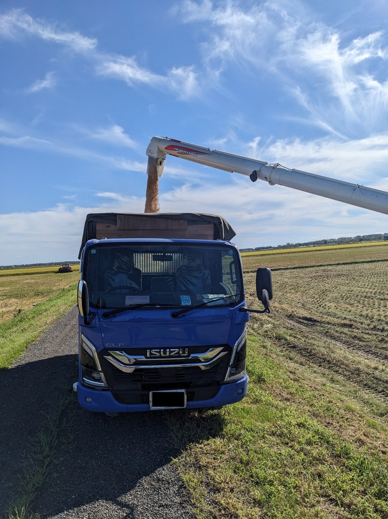 何度か前後に動かしているうちにコンバインのタンクがいっぱいになり、小型の「ダンプトラック」(通称「ダンプ」)に籾を移す必要がありました。うまく位置を合わせられるか心配でしたが、プロの方が代わってくださり、安心しました。