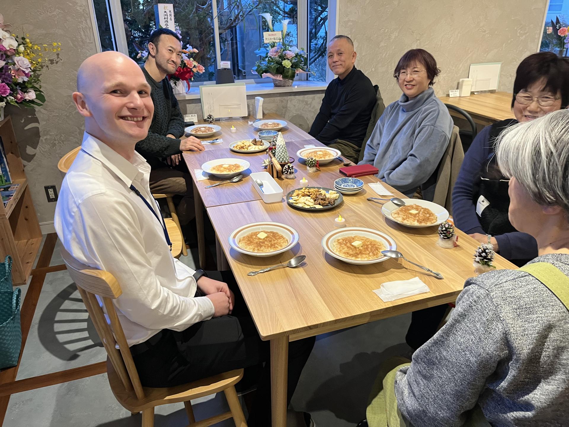 生態系公園の松ぼっくりを使用したミニ・クリスマスツリーづくりに始まり、国際交流員のマティアスさんによるデンマークのクリスマス料理・Risengrød(ミルク粥)と、会場を提供してくださったPonteさんによるデンマーク風ホットワインを楽しみながら、生態系公園ファンクラブの来年度の活動について意見交換しました。