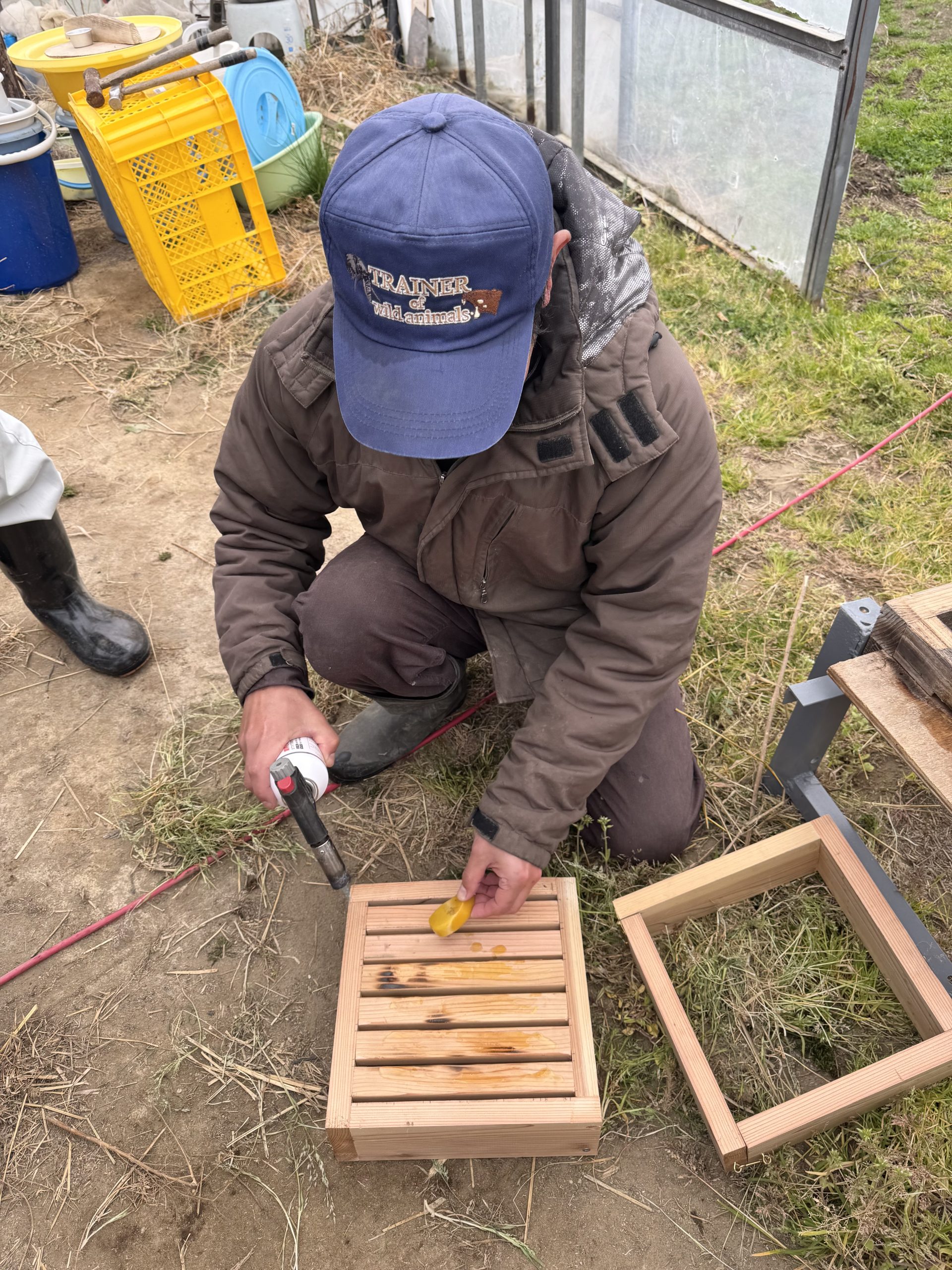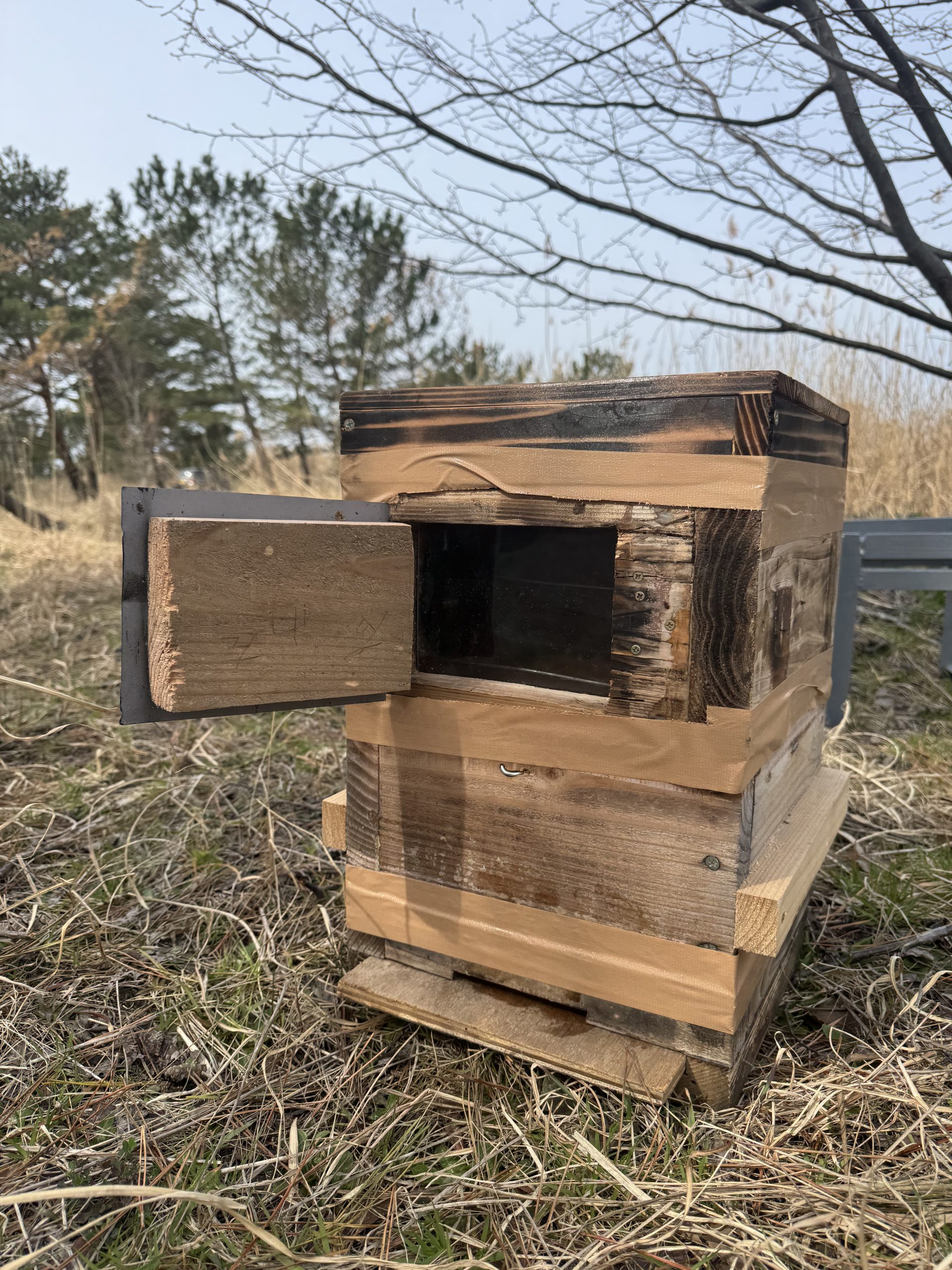 ニホンミツバチは居心地が悪いと家出をしてしまうそうなので、なるべく気持よく住んでもらえるように木の素材や厚さを考えたり、箱の隙間から光が入らないようにテープを貼ったり、風が通るようにしたり、一つひとつに工夫が凝らされています。