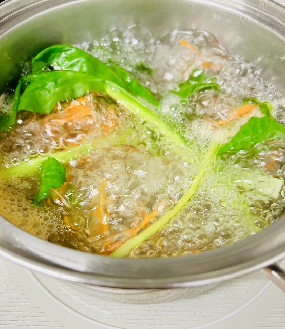 小松菜は茹でてからしっかり水切りし、1㎝幅に切る。