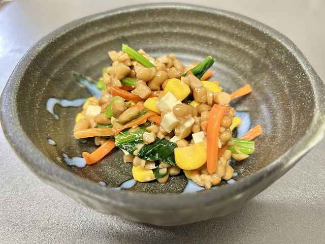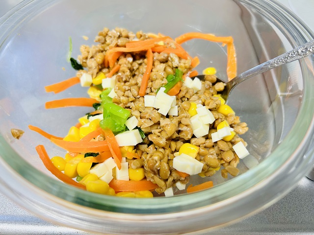 5㎜のさいの目に切ったチーズ、コーン、納豆、野菜類をしょうゆで和えて、