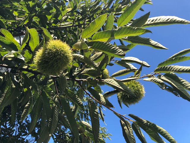 見上げると、まん丸のイガグリが枝をしならせていました。