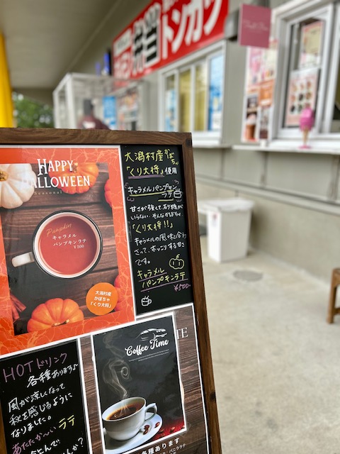 産直センター潟の店内に8月にオープンしたTreat Box(トリートボックス)さんでは、大潟村産かぼちゃ「くり大将」を使用したドーナツやラテが販売されていました^^