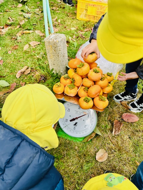 柿をはかりに乗せてみる子どもたち。