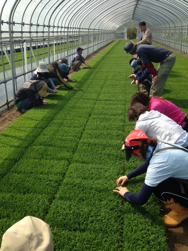 指導担当者の説明に耳を傾け、苗の様子を確認する面々。