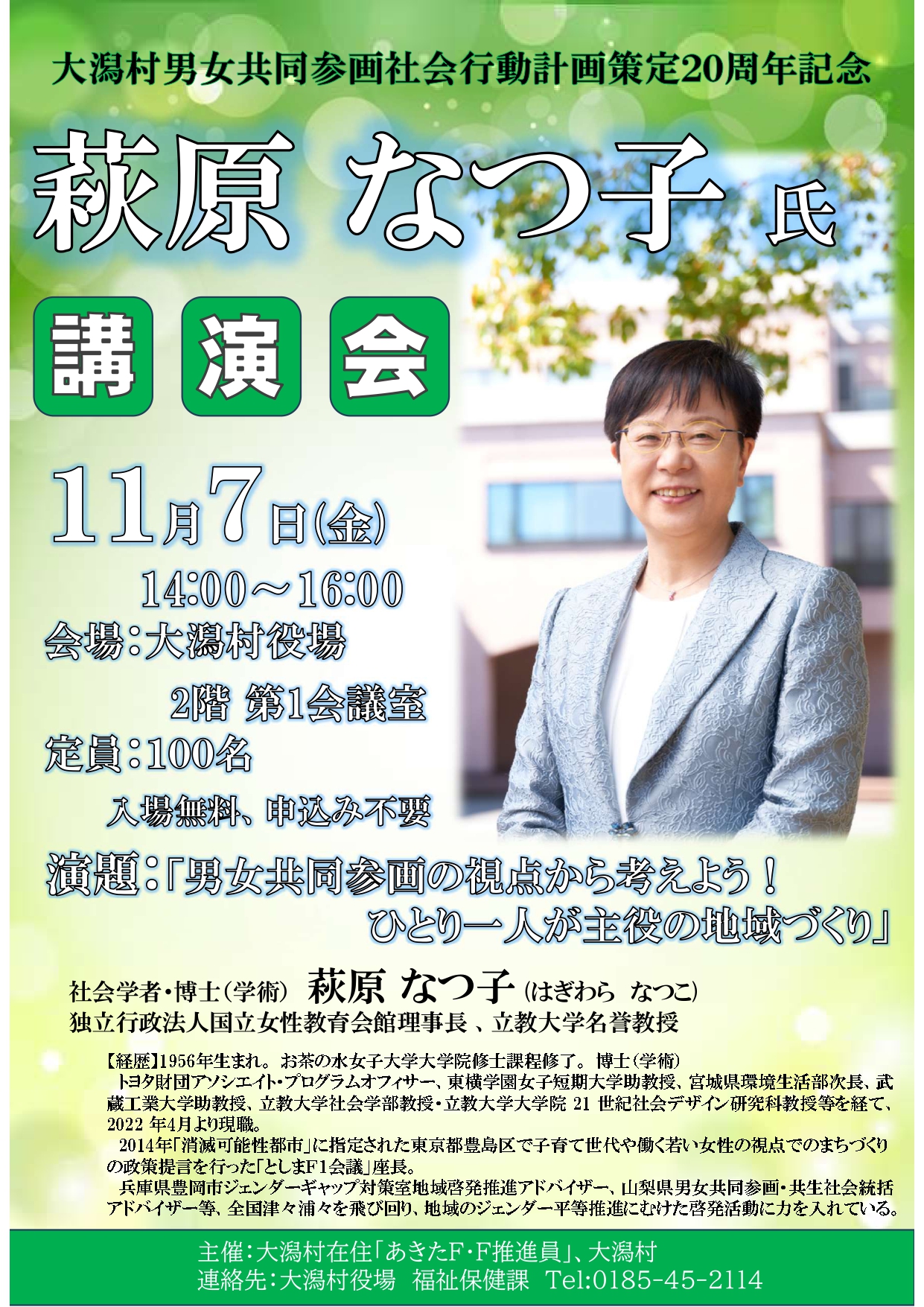 「大潟村男女共同参画社会行動計画」策定から今年で20年の節目を迎えたことを記念し、講演会を開催いたします。